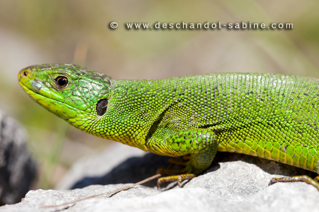 : Lézard vert occidental (Lacerta bilineata), femelle, Heudreville-sur-Eure (27), France.