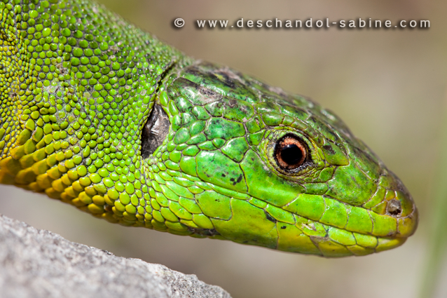 : Lézard vert occidental (Lacerta bilineata), femelle, Heudreville-sur-Eure (27), France.