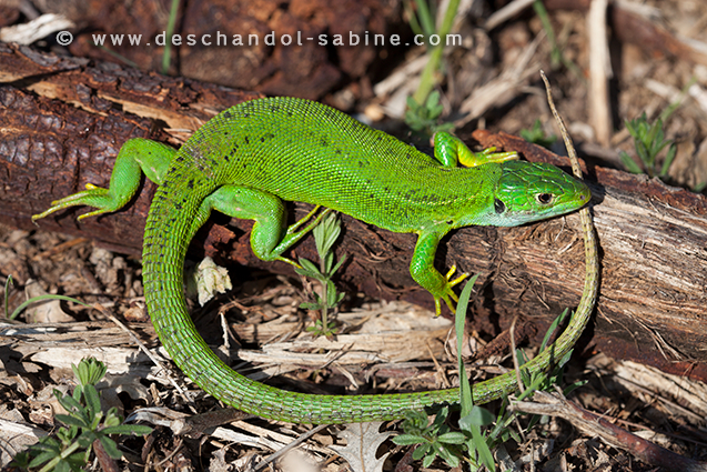 : Lézard vert occidental (Lacerta bilineata), femelle, Burgos, Espagne.