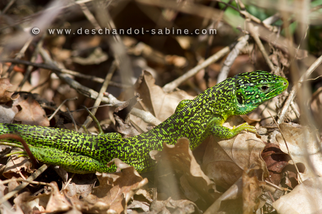 : Lézard vert occidental (Lacerta bilineata), Parc de la Brenne (36), France.