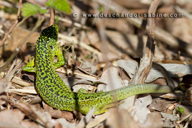 : Lézard vert occidental (Lacerta bilineata), Parc de la Brenne (36), France.