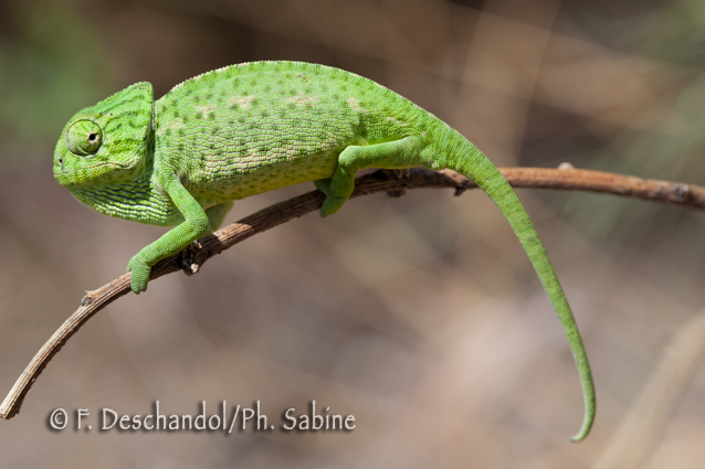 : Caméléon commun (Chamaeleo chamaeleon), Mazagon, Espagne.