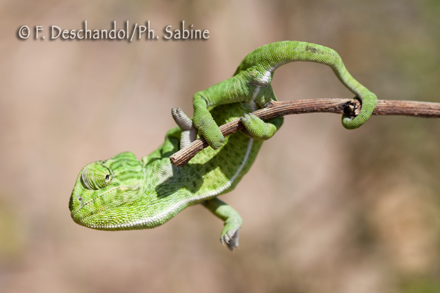 : Caméléon commun (Chamaeleo chamaeleon), Mazagon, Espagne.
