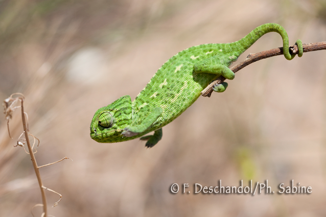 : Caméléon commun (Chamaeleo chamaeleon), Mazagon, Espagne.