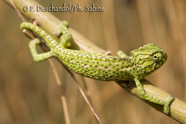 : Caméléon commun (Chamaeleo chamaeleon), Mazagon, Espagne.