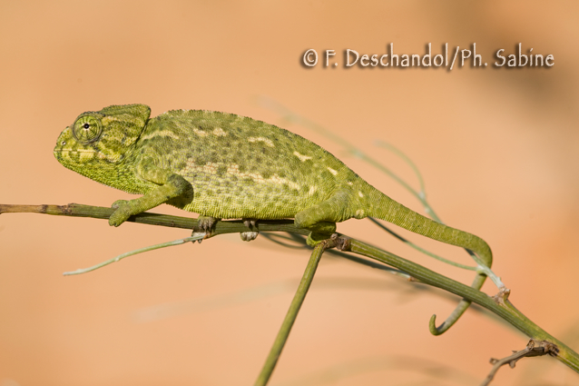 : Caméléon commun (Chamaeleo chamaeleon), Mazagon, Espagne.