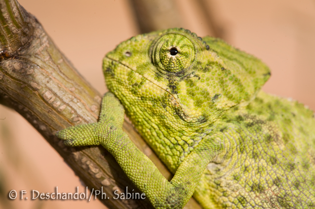 : Caméléon commun (Chamaeleo chamaeleon), Mazagon, Espagne.