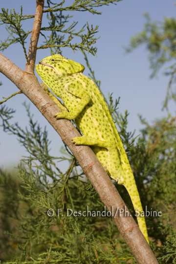 : Caméléon commun (Chamaeleo chamaeleon), Mazagon, Espagne.