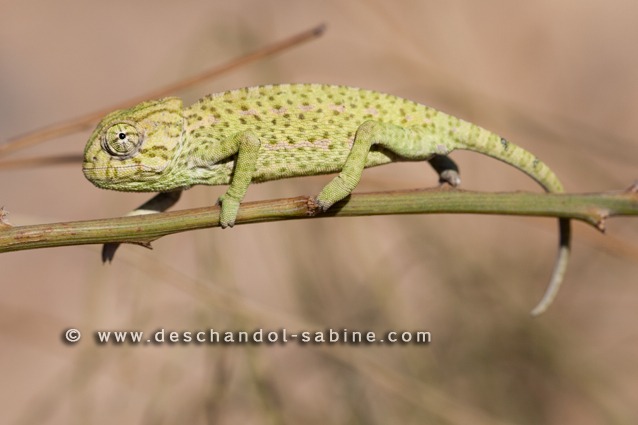 : Caméléon commun (Chamaeleo chamaeleon), jeune, Mazagon, Espagne.