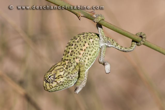 : Caméléon commun (Chamaeleo chamaeleon), jeune, Mazagon, Espagne.