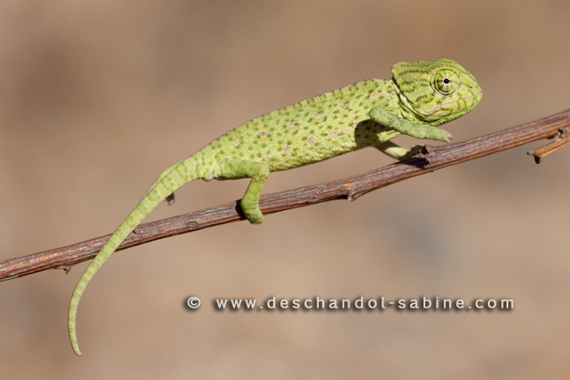 : Caméléon commun (Chamaeleo chamaeleon), jeune, Mazagon, Espagne.