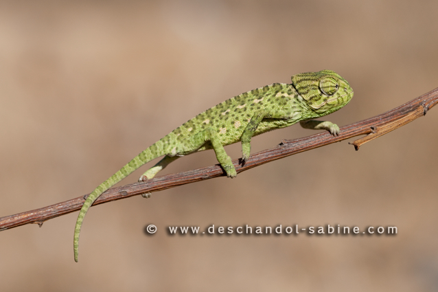 : Caméléon commun (Chamaeleo chamaeleon), jeune, Mazagon, Espagne.