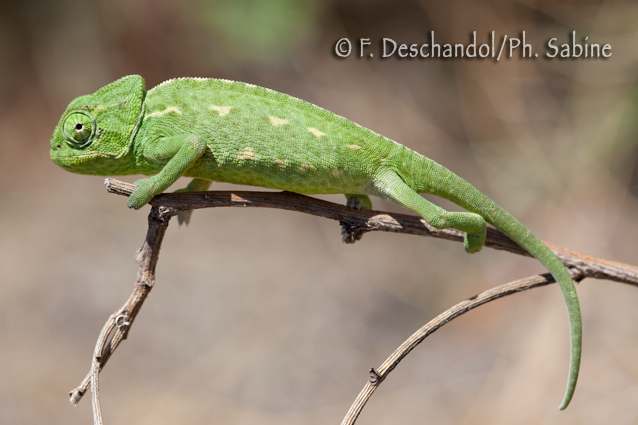 : Caméléon commun (Chamaeleo chamaeleon), Mazagon, Espagne.