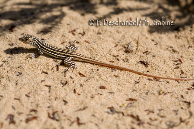 : Acanthodactyle (Acanthodactylus erythrurus), juvénile, Doñana, Espagne.