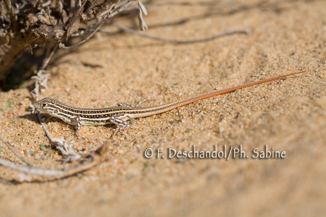 : Acanthodactyle (Acanthodactylus erythrurus), juvénile, Doñana, Espagne.