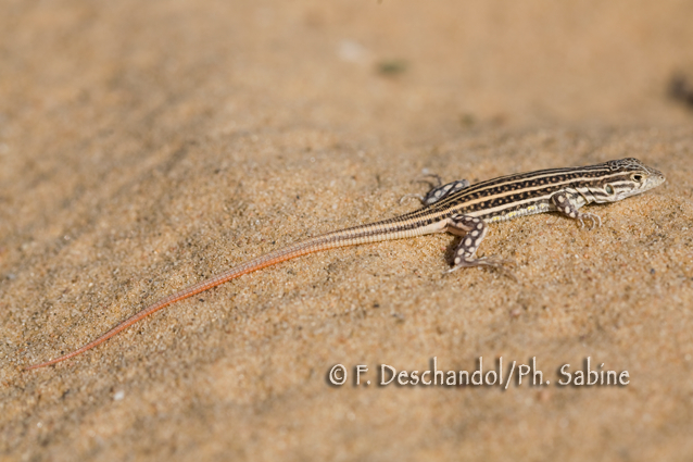 : Acanthodactyle (Acanthodactylus erythrurus), juvénile, Doñana, Espagne.