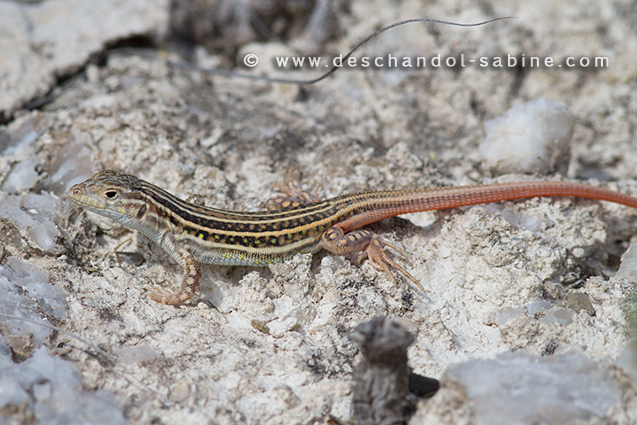 : Acanthodactyle (Acanthodactylus erythrurus), jeune, Belchite, Espagne.