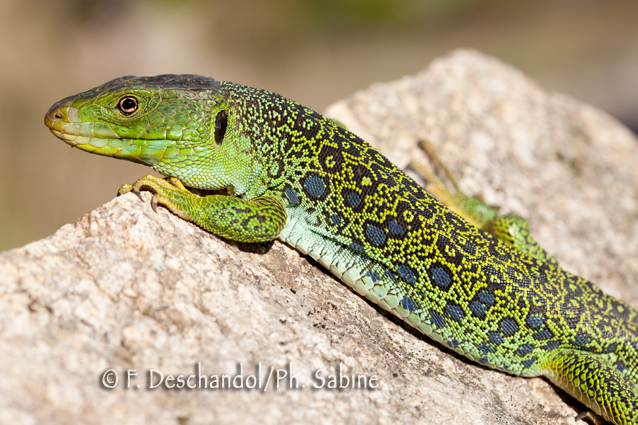 : Lézard ocellé (Timon lepidus ibericus), mâle, Fondevila, Espagne.