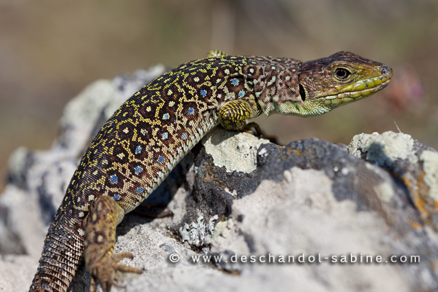: Lézard ocellé (Timon lepidus ibericus), subadulte, Lariño, Espagne.