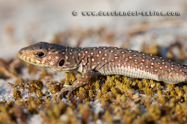 : Lézard ocellé (Timon lepidus ibericus), juvénile, Lariño, Espagne.