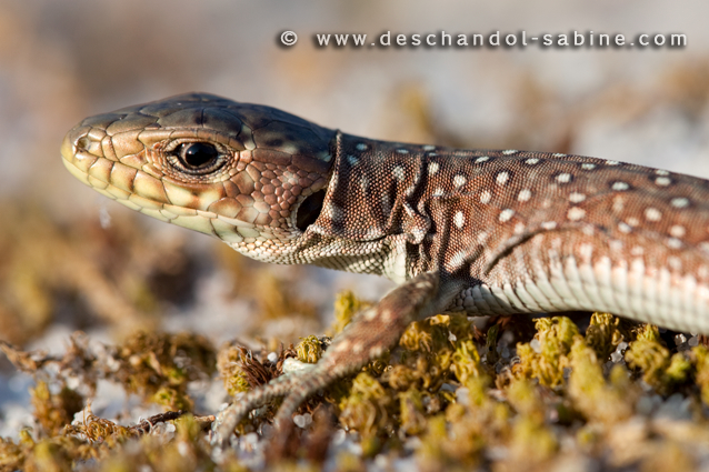 : Lézard ocellé (Timon lepidus ibericus), juvénile, Lariño, Espagne.