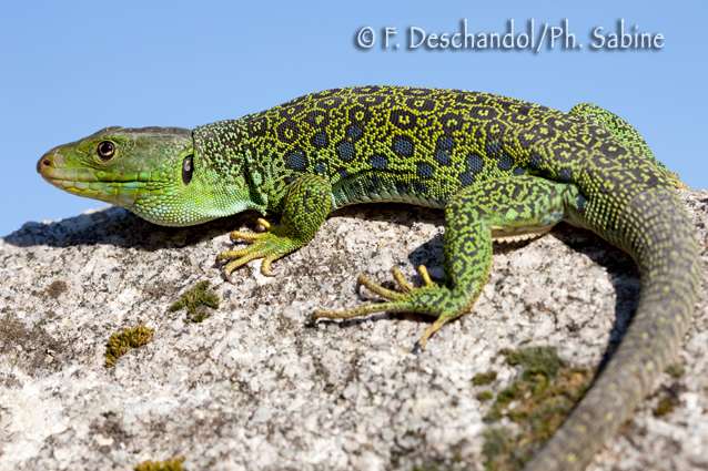 : Lézard ocellé (Timon lepidus ibericus), mâle, Fondevila, Espagne.