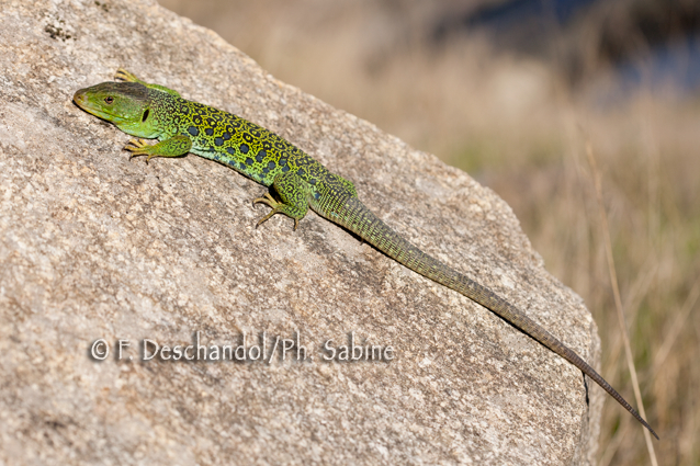 : Lézard ocellé (Timon lepidus ibericus), mâle, Fondevila, Espagne.