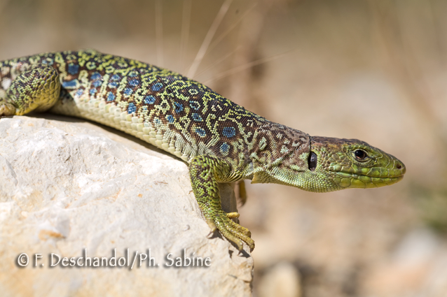 : Lézard ocellé (Timon lepidus lepidus), femelle, Parc Alto Tajo, Espagne.