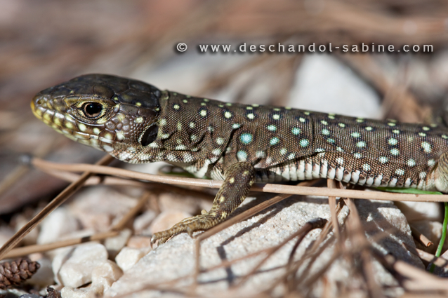 : Lézard ocellé (Timon lepidus lepidus), juvénile, Sierra de Cazorla, Espagne.