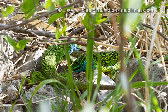 : Lézards verts orientaux (Lacerta viridis viridis), mâles au combat, Gracac, Croatie.