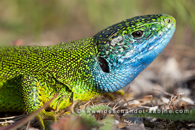 : Lézard vert oriental (Lacerta viridis viridis), mâle, Croatie.