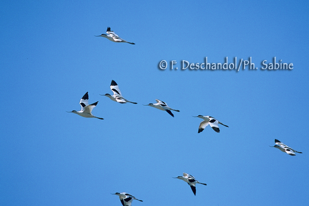 : Avocettes (Recurvirostra avosetta), en vol, Baie de Seine (76), France.