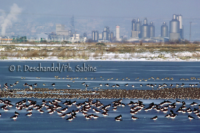 : Huîtriers-pies (Haematopus ostralegus), et Bécasseaux, Baie de Seine (76), France.