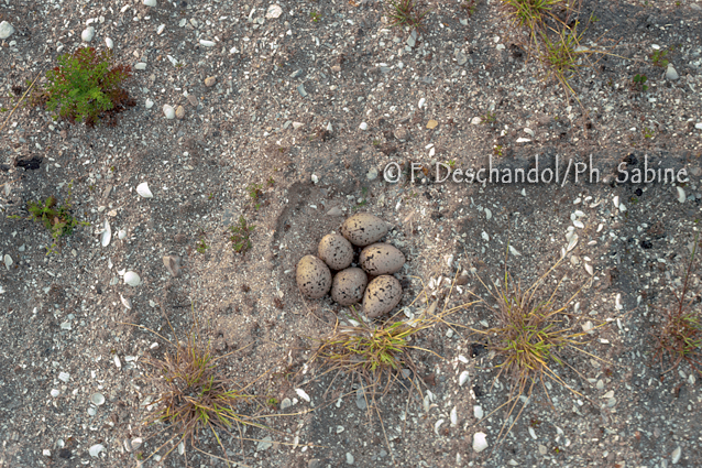 : Huîtrier-pie (Haematopus ostralegus), nid et 6 oeufs, Baie de Seine (76), France.