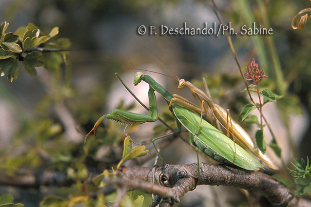 : Mantes religieuses (Mantis religiosa), accouplement, Baie de Seine (76), France.