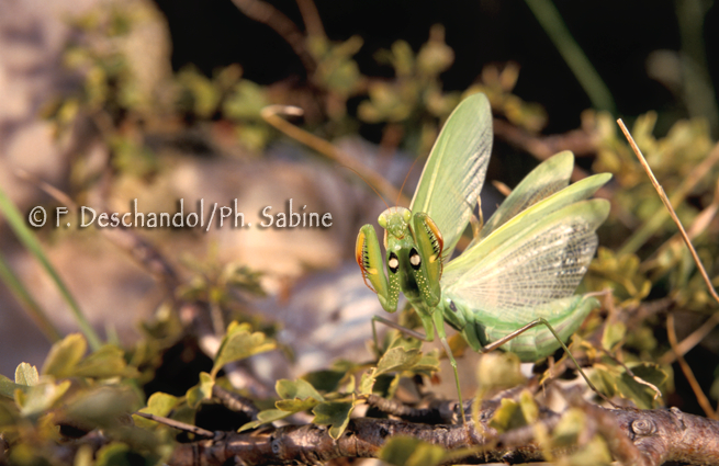 : Mante religieuse (Mantis religiosa), femelle en position d'intimidation, Baie de Seine (76), France.