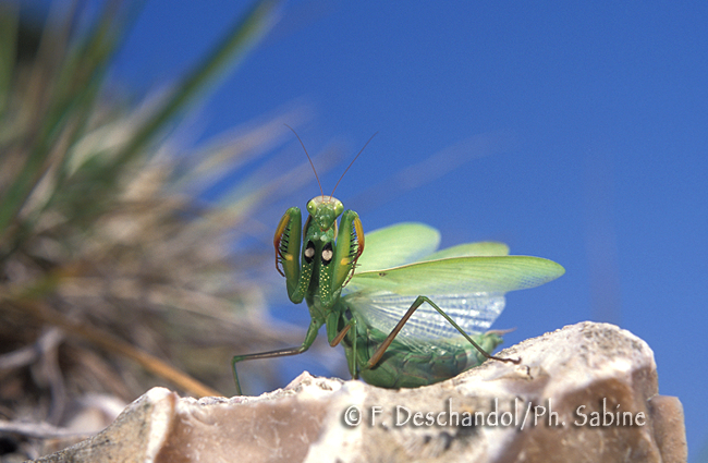: Mante religieuse (Mantis religiosa), femelle en position d'intimidation, Baie de Seine (76), France.