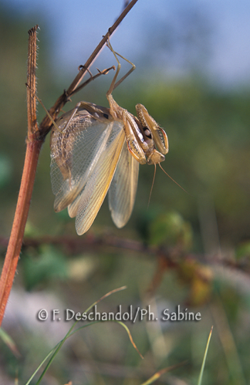 : Mante religieuse (Mantis religiosa), femelle forme brune en position d'intimidation, Baie de Seine (76), France.