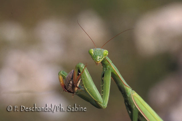 : Mante religieuse (Mantis religiosa), femelle dévorant un orthoptère, Baie de Seine (76), France.