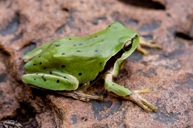 : Rainette méridionale (Hyla meridionalis), mâle, forme de l'Anti-Atlas, Oukaïmeden, Maroc.