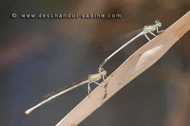 : Pennipattes blanchâtres (Platycnemis latipes), couple, Sierra de Cazorla, Espagne.