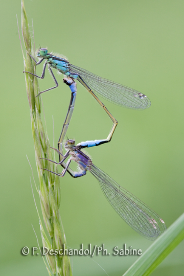 : Agrions élégants (Ischnura elegans), accouplement, Bouveran (25), France.