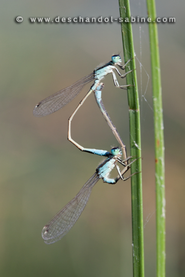 : Agrions ibériques (Ischnura graellsii), accouplement, Embalse de Navalcan, Espagne.