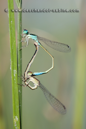 : Agrions ibériques (Ischnura graellsii), accouplement, Embalse de Navalcan, Espagne.