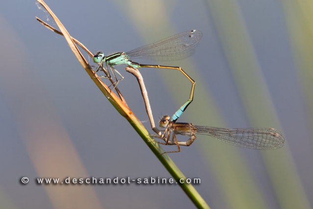 : Agrions ibériques (Ischnura graellsii), accouplement, Embalse de Navalcan, Espagne.