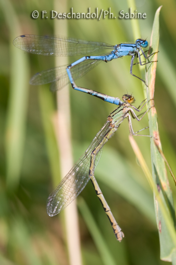: Agrion porte-coupe (Enallagma cyathigerum), mâle et femelle, Bouveran (25), France.