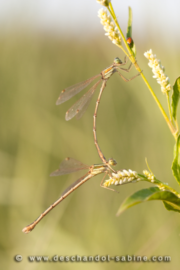 : Lestes sauvages (Lestes barbarus), couple, Baie de Seine (76), France.