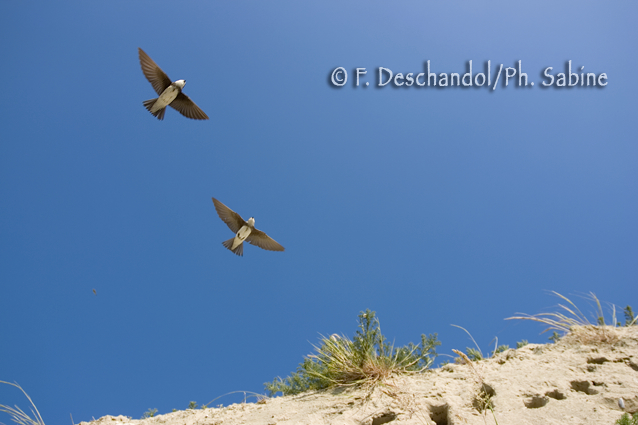 : Hirondelles de rivage (Riparia riparia), en vol, colonie, Baie de Seine (76), France.