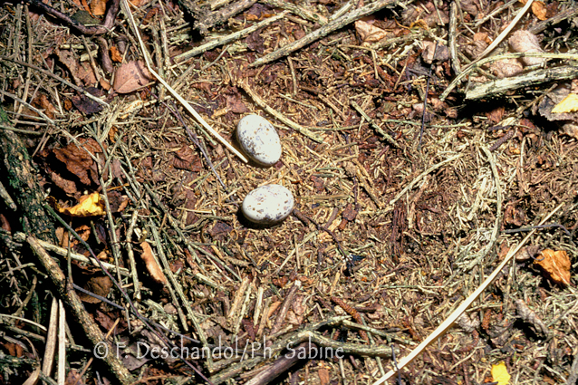 : Engoulevent d'Europe (Caprimulgus europaeus), nid et oeufs, Forêt de Brotonne (76), France.