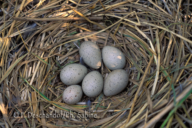 : Foulque noire (Fulica atra) nid et oeufs, avec un oeuf de Poule d'eau (Gallinula chloropus), Baie de Seine (76), France.